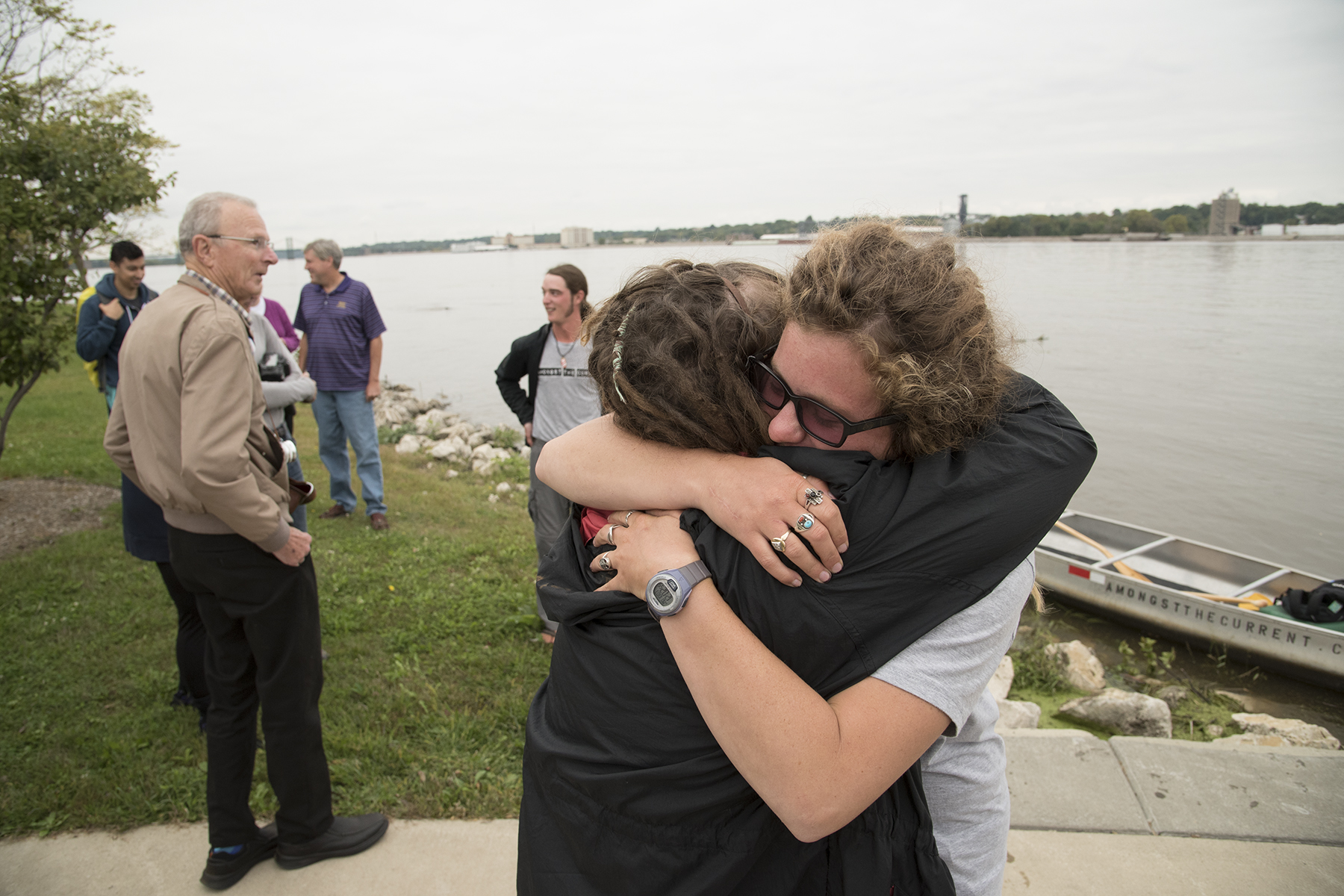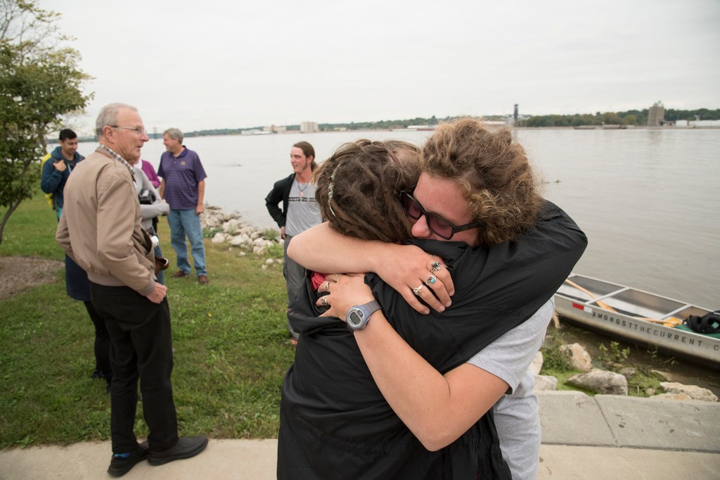 It was clear from Haley Brasile’s and Cody Presny’s wide smiles and zealous waves from their canoe that the couple was about to encounter people they love waiting for them along the banks of Mighty Mississippi. Two weeks ago Monday, when they pulled up to the rocky river bank near the Western Illinois University-Quad Cities campus, the pai — both alumni of the WIU Department of Recreation, Park and Tourism Administration (RPTA)—were greeted by Quad Cities’ reporters, city leaders, community representatives and a few curious onlookers. But it was members of their WIU family — specifically members of their “WIU RPTA kin” (including students, faculty and staff) — who received the warm hugs, the knowing grins and hearty handshakes. To those of us there to meet the ambitious, yet down-to-earth couple, it was just as clear to us we were witnessing a happy family reunion.