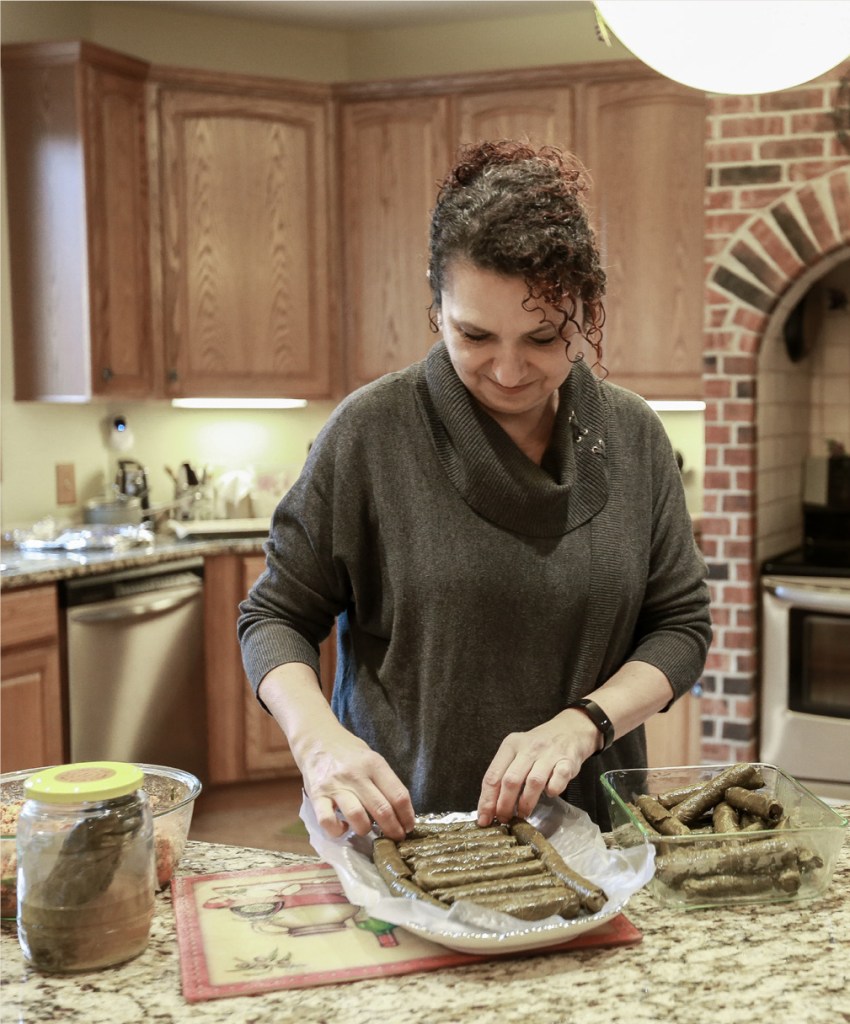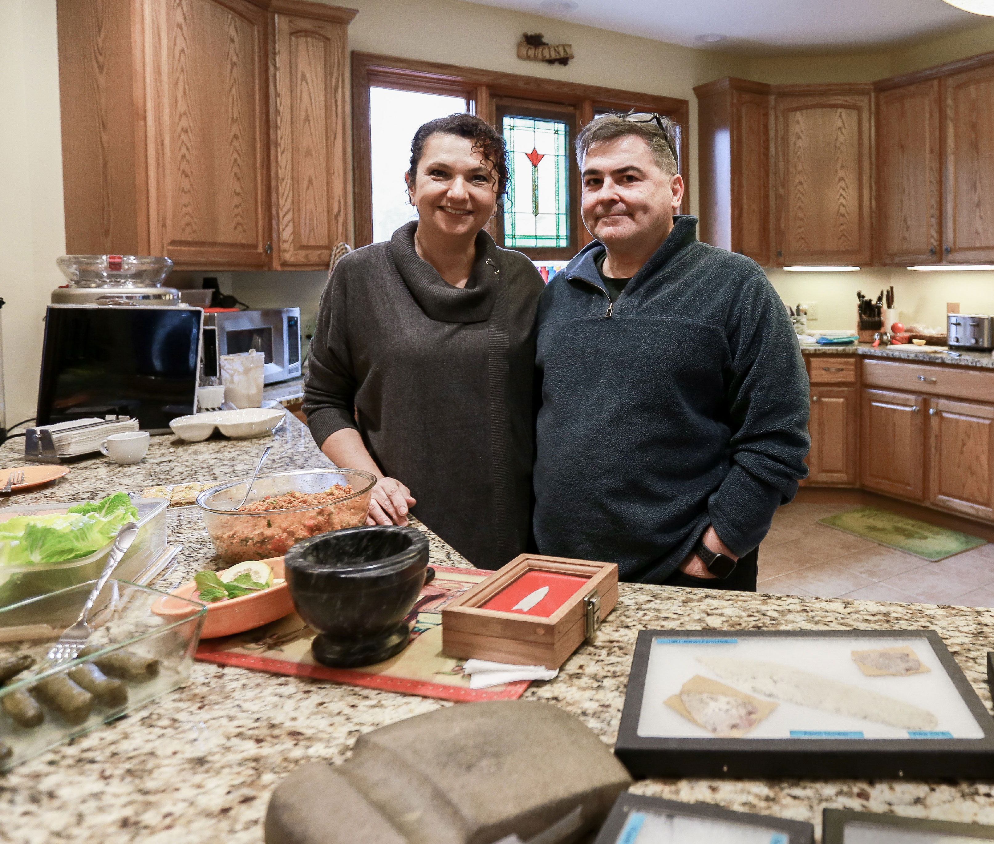 First, Dr. Ayca shared a favorite family recipe for stuffed grape leaves (dolmas). She took us through the steps of making the Mediterranean staple. Her version of the dish is based on her mother-in-law’s recipe. We were also taken on a jaunt back in time through Dr. Korhan’s stories of how he has accumulated his extensive collection of Native American artifacts — many of them native to Pike County and surrounding west central Illinois counties — which he carefully laid out on the kitchen countertops during our visit. At Dr. Ayca’s urging, we followed him into their cozy living room, where he also recounted how he has come to collect swords from various eras in history. His sword treasure trove includes a Japanese sword dated to 1316, a Revolutionary War sword from 1763 found in Calhoun County (Illinois), and two Tiffany & Co. Civil War-era swords, one from 1862 and another from 1863.